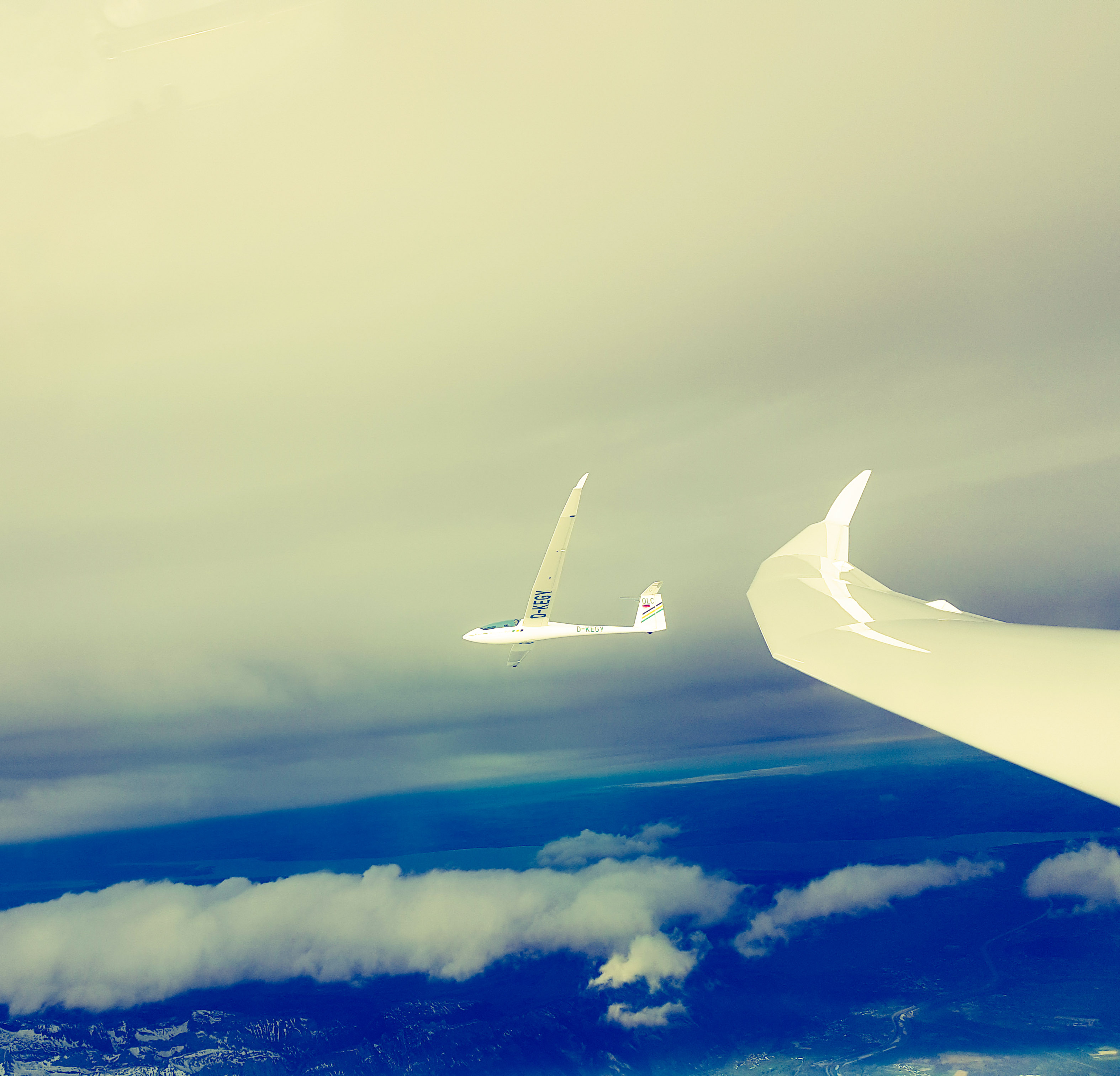 In unserer mit Eisblumen verzierten Haube sahen wir nun die "OLC", wie sie sich unter tollen Lichtreflexionen an unsere Fläche setzte. Vor uns ein großes, dunkles Meer aus vereinzelten Wolken, viel Schatten und wenigen Lichtstrahlen, ein Anblick welcher einem nur unwirklich erscheint. Völlig überwältigt von den Ausblicken flogen wir in Formation gemeinsam Richtung Westen bis nach Schaenis und beobachteten wundervolle Lichtspiele über dem Walensee und Schneeverwirbelungen an den Berghängen. Bedingt durch die sehr geringe Geschwindigkeit über Grund fühlte sich die Zeit wie angehalten an und man hat Zeit, inne zu halten und die Schönheit der Natur zu beobachten. Zurück in den Osten ging es mit einer Grundgeschwindigkeit von circa 300 Km/h und man fühlte sich eher wie in einem Airliner als in einem Segelflugzeug.
