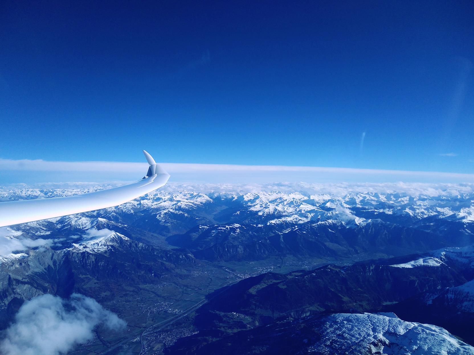 Dort angekommen klinkten wir in 2500 Metern Flughöhe aus und versuchten am „Hohen Kasten“ unser Glück in die Welle einzusteigen. Nach recht kurzer Phase, in der wir in Rotoren, also sehr turbulenten Luftmassen, kämpfen mussten, schafften wir den Einstieg in die Welle und tauchten in eine völlig surreale Welt ein: In völlig ruhiger und laminarer Luft steigen wir mit über drei Metern pro Sekunde schnell bis auf 4000 Meter (Flugfläche 130). Um weiter steigen zu dürfen mussten wir eine Flugverkehrsfreigabe bei der Zürcher Flugsicherung einholen. Unsere Befürchtungen, dass wir keine Freigabe aufgrund der Verkehrssituation erhalten würden, bestätigten sich nicht. Von der Fluglotsin in der Verkehrsleitstelle Zürich erhielten wir absolut unkompliziert vorerst eine Freigabe für Flugfläche 150 und später dann für Flugfläche 200 (ca. 6000m MSL). Das Zitat: „Die Controllerin würde ich sofort heiraten“ spiegelte unsere Freude für die Freigabe wieder. So stiegen wir weiter an den Wolken vorbei und ein nahezu unendlicher Horizont eröffnete sich vor uns. Die vom Boden aus so mächtigen Alpen werden auf einmal klein wie ein Miniatur Wunderland und zeigen sich angestrahlt von der Sonne von ihrer schönsten Seite. Wir beobachten, wie der Föhnsturm den Schnee über die Bergrücken- und Seen treibt und in die Luft pulverisiert. Mit inzwischen 100 Km/h Gegenwind steigen wir weiter bis auf 6000 Meter und bewegen uns mit einer Geschwindigkeit von 15 Km/h über Grund Richtung Süden über ein Wolkenmeer, dessen Anblick einem den Atem stocken lässt. Die Temperatur beträgt inzwischen -20° C und kleine Eisblumen bilden sich auf der Haube des Cockpits. Bedingt durch die langsame Geschwindigkeit über Grund fühlt sich die Zeit wie angehalten an und man hält inne und versucht zu begreifen, in welcher unbeschreiblich schönen Landschaft man sich gerade bewegt.