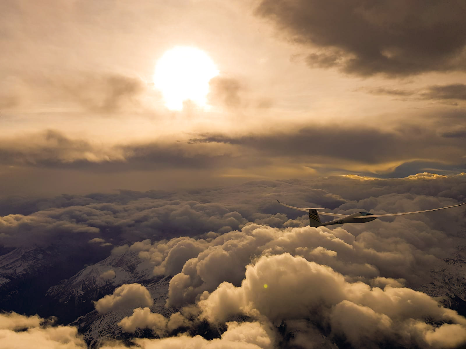 In unserer mit Eisblumen verzierten Haube sahen wir nun die "OLC", wie sie sich unter tollen Lichtreflexionen an unsere Fläche setzte. Vor uns ein großes, dunkles Meer aus vereinzelten Wolken, viel Schatten und wenigen Lichtstrahlen, ein Anblick welcher einem nur unwirklich erscheint. Völlig überwältigt von den Ausblicken flogen wir in Formation gemeinsam Richtung Westen bis nach Schaenis und beobachteten wundervolle Lichtspiele über dem Walensee und Schneeverwirbelungen an den Berghängen. Bedingt durch die sehr geringe Geschwindigkeit über Grund fühlte sich die Zeit wie angehalten an und man hat Zeit, inne zu halten und die Schönheit der Natur zu beobachten. Zurück in den Osten ging es mit einer Grundgeschwindigkeit von circa 300 Km/h und man fühlte sich eher wie in einem Airliner als in einem Segelflugzeug.